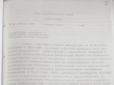 С апреля 2002 года согласно постановления Главы Красночикойского района № 66 от 11 февраля 2002 года «О структурных изменениях в МНУ «Комитет культуры и искусства» создано новое подразделение комитета – Муниципальное некоммерческое учреждение «Центральная районная библиотека» с библиотечными филиалами в селах: Урлук, Жиндо, Альбитуй, Большая Речка, Катанца, Шергольджин, Байхор, Барахоево, Фомичево, Малоархангельское, Коротково, Шимбилик, Черемхово, Афонькино, Менза, Этытэй.
